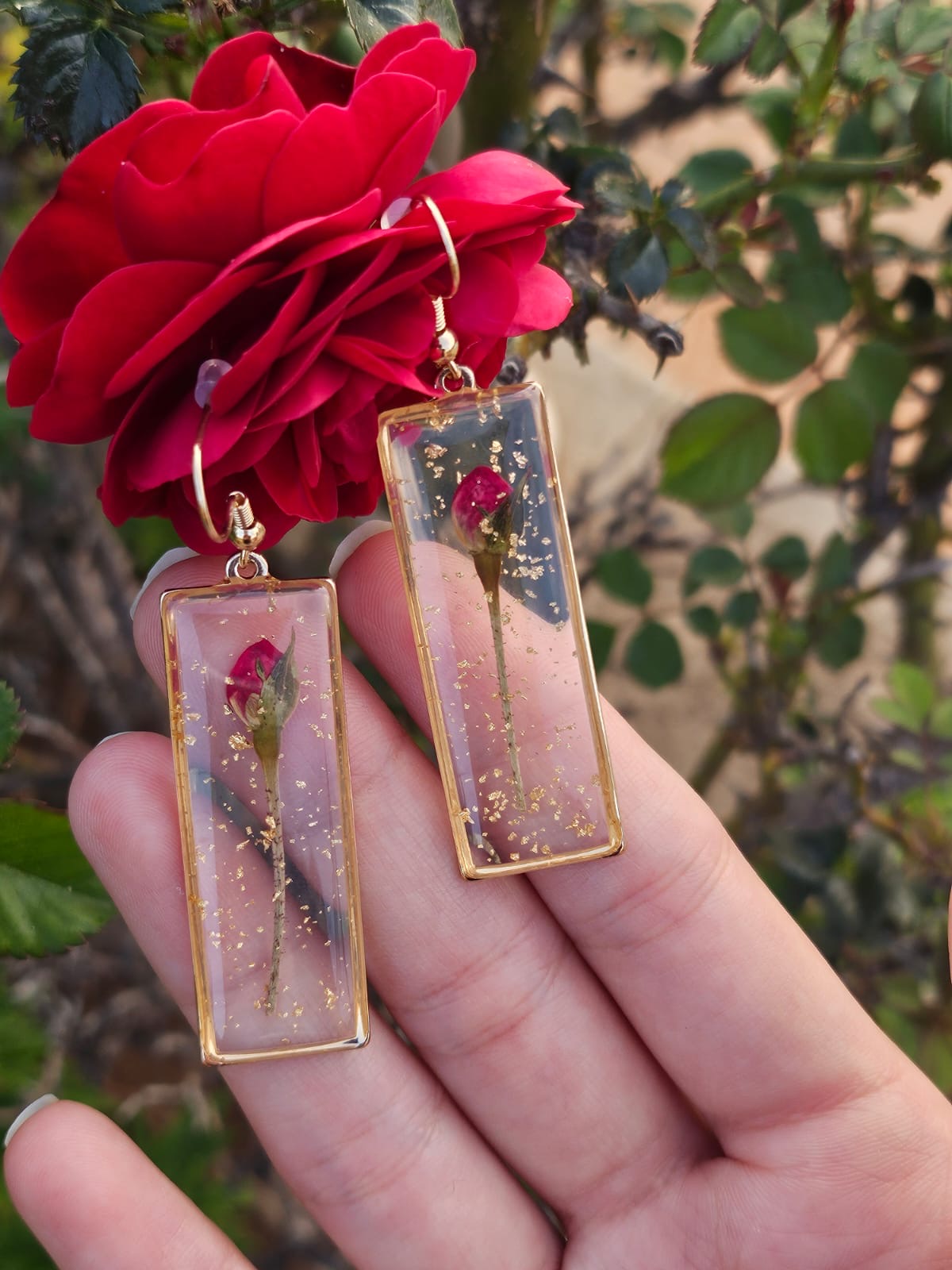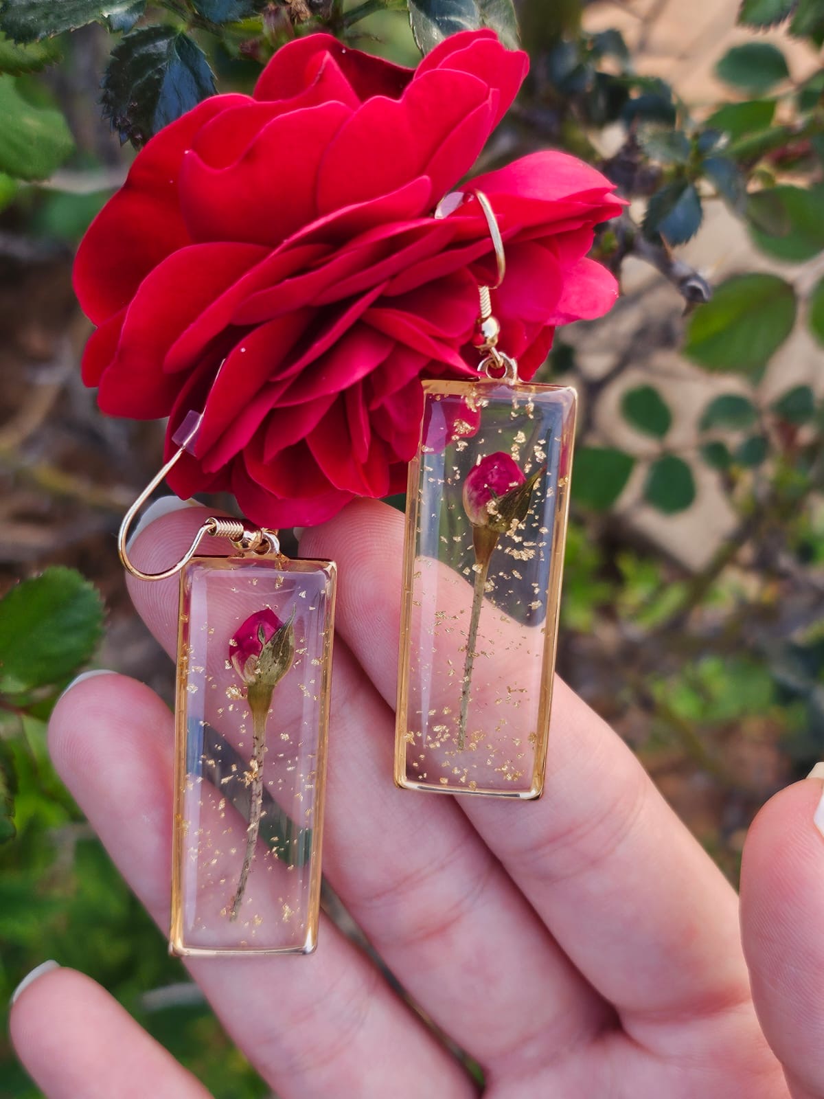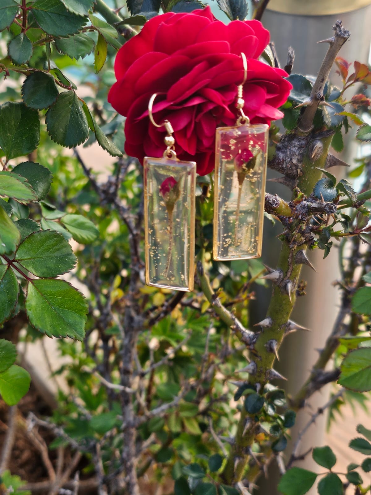 A beautiful pair of real-life rose bud earrings preserved forever in quality resin to keep a little piece of summer wherever you go.